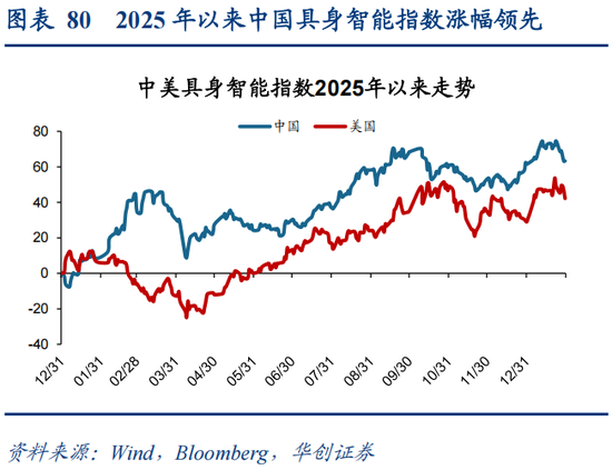 2025年至今中国具身智能指数股价涨幅明显领先。据人形机器人场景应用联盟统计,截至25年6月全球人形机器人本体企业数量已经超300家。其中,中国企业数量超过150家占比50%;美国企业数量超过60家占比20%;日本企业数量超过30家占比10%;其余国家企业数量均在10家以内。从上市公司资本市场表现来看,由于美股中不存在具身智能指数,我们以瑞银AI机器人指数成份股、BITA全球自动驾驶精选指数中美国成份股以及具备人形机器人与自动驾驶概念的相关个股构建等权指数(共计52只成份股),并与万得具身智能概念指数做对比分别用以衡量中美资本市场中具身智能领域相关上市公司表现。截至2026/1/30中美两国具身智能领域相关上市公司总市值分别为8.5万亿元与120.9万亿元(成份股平均市值717亿与2.3万亿);成份股PE_TTM中位数分别为79.9倍与45.0倍(剔除负数);成份股2024年净利润增速中位数分别为0.4%与-3.2%;2025年以来累计涨跌幅分别为63.3%与42.1%,股价走势接近但中国涨幅明显强于美国。整体来看,中国具身智能产业上市公司数量较多但市值较小,估值偏高但涨幅明显领先。