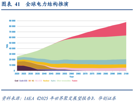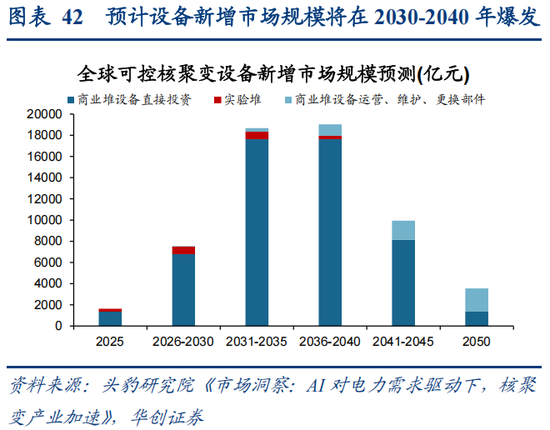 人类能源问题的终极方案。可控核聚变是通过在极端高温高压条件下,使轻原子核(如氘和氚)克服库仑斥力发生融合,释放出巨大能量,并实现稳定、持续、可控制的能量输出过程,其原理模仿太阳等恒星内部的能源机制。因其具备清洁、安全、高效、燃料充足等优势,可控核聚变被誉为“人类能源问题的终极方案”。一旦实现商业化,将提供几乎取之不尽的零碳基荷电力,彻底解决能源短缺与气候变化双重挑战。根据国际原子能机构(IAEA)预测,随着可再生能源的快速发展,传统化石能源在本世纪中叶将被逐步淘汰,随着技术进步与成本的大幅下降,核聚变有望迎来快速发展,预计2075年聚变发电在全球发电中的占比将达到15%,到2100年将达到27%。当前可控核聚变技术路径大致可分为磁约束、惯性约束与替代/混合路线,其中以托卡马克为核心的磁约束路径是当前最成熟、最接近商业化的路线,国际热核聚变实验堆(ITER)、中国EAST、美国NIF等项目已取得关键突破,正加速迈向工程验证与示范应用阶段,预计未来几年中行业有望进入密集的资本开支时期。据头豹研究院预测,可控核聚变设备新增市场规模将于2030-2040年间爆发,10年间新增设备规模合计有望达到3.8万亿人民币。