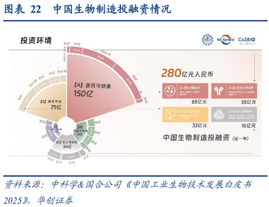 中国生物制造领域资金主要投向医药健康板块。根据Crunchbase数据调查显示,2023年美国生物技术公司共吸引了567.9亿美元的资金(约占全球33.3%),中国企业达到206.1亿美元(12.7%)。近些年美国政府也在持续加大对生物制造领域的投资力度,2022年拜登总统签署“国家生物技术和生物制造计划”的行政命令后,各政府部门和机构宣布投入20余亿美元推进该计划;此后联邦投资从27亿美元持续增加到超过35亿美元,截至2024年底已刺激了460亿美元的公共和私营部门生物制造投资。相较于美国,中国投融资规模仍存在较大的提升空间。根据《中国工业生物技术发展白皮书》,截至25年10月,近一年中国生物制造领域投融资合计达到280亿元,其中医药健康板块150亿元、农业食品板块19亿元、化工材料板块34亿元、能源环境板块1.5亿元、技术平台板块75亿元。从细分赛道来看,基因与细胞治疗(65亿)、蛋白药物/抗体药物(55亿)、设计平台和工具(33亿)、生物基材料(16亿)投融资规模领先。相较于美国,我国当前在生物制造领域投资力度有待提升且政府层面的产业投资相对欠缺。