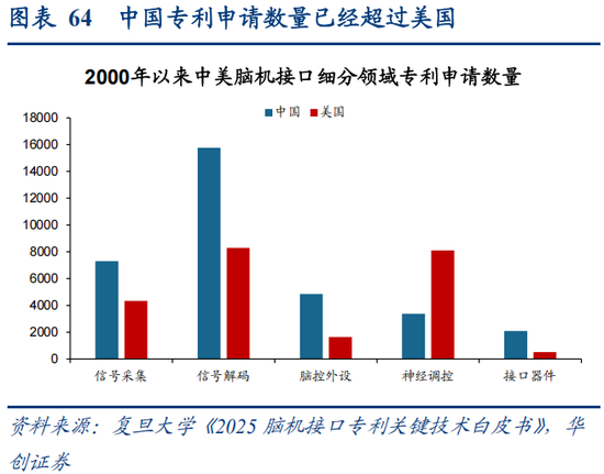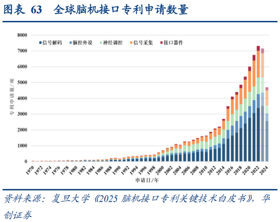 脑机接口全球专利申请数量快速增长。根据复旦大学《2025脑机接口专利关键技术白皮书》统计,自上世纪七十年代技术萌芽以来,脑机接口专利申请持续增长,尤其近十年的申请数量保持快速增长态势。各技术细分中,随着智能算法、新材料新工艺等关联技术的创新发展,信号解码、信号采集等专利申请数量明显增加;涉及脑机接口技术应用场景的神经调控与脑控外设同步保持增长态势,神经调控近十年趋向于平稳增长。从中美情况来看,2000年至今中国脑机接口领域专利申请数量达到3.3万件(约占全球的50.1%),已经超过美国的2.3万件(34.4%)。从细分技术来看,除神经调控以外,中国在信号采集/信号解码/脑控外设/接口器件领域均已经超过美国,近十年内中国已成单一市场专利申请首位。此外,以专利族的最早优先权国别为指标统计,在美国产生的全球同族专利申请平均数为3.87件,中国仅为1.11件,说明美国仍是当前全球脑机接口专利申请的重要技术来源地。相比之下中国的专利优势体现在国内市场的数量广度和规模上,而美国的优势则体现在高价值专利的全球布局深度和质量上。