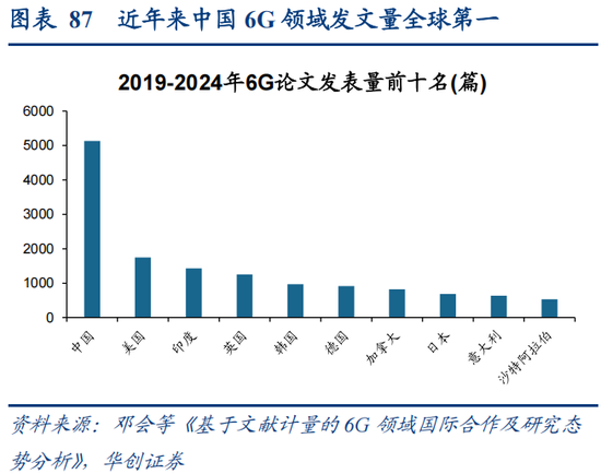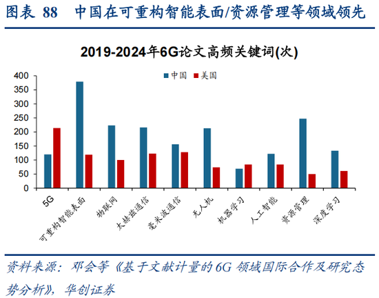 政策资金推动下全球6G科研产出快速增加。根据《中国互联网发展报告2025》统计,中国6G专利申请量占比达到40.3%位居全球第一。从论文发表数量来看,近年来随着各国对6G领域政策支持和资金投入不断增强,6G领域的科研关注程度迅速增长:6G相关论文全球发表数量从2019的113篇快速上升至2024年的5295篇。从发文国家来看,2019-2024年间中国发表数量达到5130篇,占比36.8%,远超第二名美国1745篇(12.5%)、第三名印度1428篇(10.2%)。从根据高频关键词统计的重点研究领域来看,中国在可重构智能表面(379次)、资源管理(247次)、太赫兹通信(216次)等方向的研究产出显著高于其他国家,其中可重构智能表面频次达到第2名美国(119次)的3.2倍,凸显了中国在6G领域研究的优势。美国在5G技术(214次)研究上保持全球领先,同时太赫兹通信(123次)和毫米波通信(128次)的研究规模仅次于中国,此外在人工智能(84次)、机器学习(84次)、深度学习(61次)方向的关键词频次同样相对较高,反映出美国在现有通信技术优化、高频段通信研发以及智能化通信研究等方面具有较高关注度与投入。