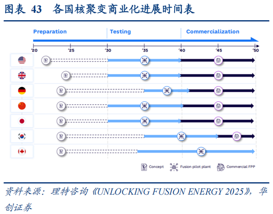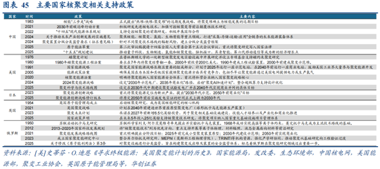近五年国内外政策力度显著提升。中国在80年代首次正式提出“热堆-快堆-聚变堆”的远期发展战略,相较于美、俄、英、德等发达国家对于核聚变的研究时间相对落后,且政策连续性较为欠缺,但“十四五”以来发展迅速,在全球规模最大的国际热核聚变实验堆(ITER)研究中贡献不可或缺的中国力量,据头豹研究院测算ITER中国承制的部件价值已经达到40亿元。随着核聚变迈入商业化应用落地的新阶段,各国对核聚变竞争的紧迫感明显加强,带动相关政策支持力度明显提升,如美国2025年出台迄今为止最详细、最明确的行动指南《聚变科学与技术路线图》,并希望通过《聚变先进制造平等法案》进行税收激励以降低产业链成本,美国能源部还通过设立独立聚变办公室,将聚变事务从一般的科研项目管理升级为国家优先战略任务。中国在“十四五”时期开始在核聚变政策上集中发力,2021年《2030年前碳达峰行动方案》提出“加强可控核聚变等前沿颠覆性技术研究”;2025年原子能法草案首次将聚变写入法律,且将核聚变作为未来产业写入“十五五”规划。相较于海外,目前国内政策更多聚焦于研究性领域支持,对商业化落地、监管框架、资金投入等方面的支持仍有待进一步完善。