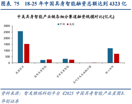 中国偏向硬件先行,美国注重数据与算法驱动。根据《2025中国具身智能产业星图》统计,2018-2025年中美具身智能产业链76家头部企业中,中国企业融资总额达到4323亿元,超越美国企业的2832亿元。从产业链细分方向来看,中国更注重底座技术层融资(约占总融资额59.5%),其中电力、存储等基础设施领域融资较多,充分体现对能源支撑系统和数据存储保障的重视;美国则更注重数据力与算法能力(约占总融资额63.8%),聚焦数据采集、处理与分析,助力其在人工智能算法、机器学习模型等软技术领域保持优势。同时,中美两国面对应用场景的融资偏好也不同,中国融资方向偏向工业场景(专用具身智能融资328亿元,大于美国256亿元),大力推动智能制造、工业自动化等垂直领域发展;美国更注重商用场景,资金更多流向商用、特种和消费场景,体现市场驱动、应用多元化特点。此外,从人形机器人融资情况来看中国投融资规模同样超越美国。根据中国信通院统计,2014-2024Q3中国该领域投融资事件共176起,占全球40%,投融资金额超55亿美元,占全球52%;美国人形机器人企业投融资事件共106起,占全球24%,投融资金额超34亿美元(其中有20笔投融资金额未披露),占全球33%。中国公司虽然融资总量较多但是单体融资规模较小,美国龙头公司如Figure AI及波士顿动力均获10亿美元级投资。