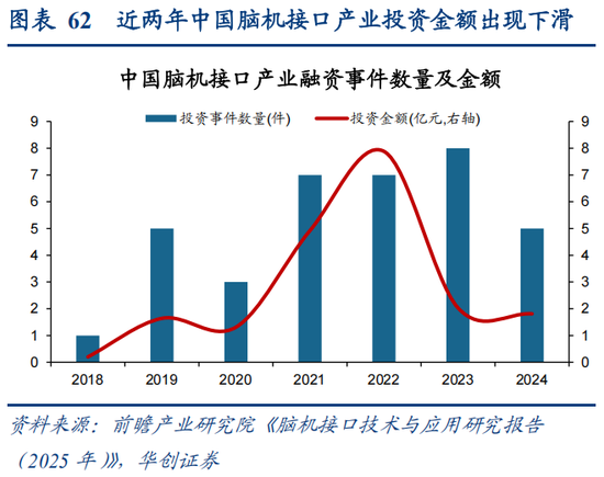 全球脑机接口投融资活跃程度显著攀升。据中银研究院统计,截至2025年2月在脑机接口领域,已公开披露的全球投融资交易笔数累计超过1500笔,投资总额接近100亿美元。其中美国相关投融资事件超过700起,总金额超过50亿美元;中国相关事件超过200起,总金额接近20亿美元。从不同技术方向来看,据中国信通院统计全球范围内聚焦有创技术路线的企业吸引了53%的资金投入,无创技术路线的企业获得了47%的资金份额。从产业链来看,11%融资金额流向上游企业,18%金额流向中游企业,71%金额流向下游企业。此外,脑机接口领域的医疗健康方向近年来成为投资热点,融资规模快速增长:2023年融资3亿美元,2024年攀升至6.1亿美元。从中美情况来看,美国企业融资规模远超过中国,且主要由少数几家明星公司主导,如马斯克创办的Neuralink在2021年C轮融资2.1亿美元/2023年D轮融资3.2亿美元/2025年E轮融资6.5亿美元;Precision Neuroscience2025年C轮融资1.0亿美元等都极大地拉高了当年的融资总量。我国脑机接口领域融资生态主要由大量规模较小的初创企业构成,投融资事件主要始于2018年,并于2021-2022年受到资本的追捧。根据深圳市人工智能产业协会数据,2025H1我国脑科学与类脑智能领域共发生14起融资事件,总规模超过8亿元人民币,2026年初强脑科技完成约20亿元融资,成为脑机接口领域除马斯克旗下的Neuralink以外世界第二大规模融资。