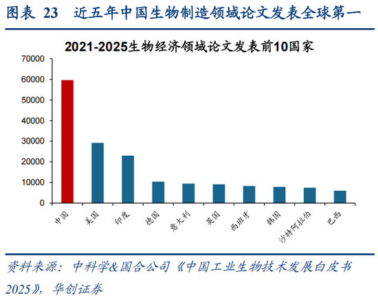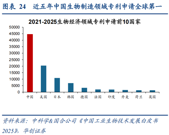 近五年中国生物制造领域论文发表/专利申请数量均处全球第一。近些年,我国在生物科学、技术等方面持续发力,取得了良好进展,根据《中国工业生物技术发展白皮书》统计,2021-2025年间中国在生物制造领域发表论文达到6.0万篇,占全球比重达到30.6%,超过美国2.9万篇(15.0%);专利申请数量达到4.5万件,占全球比重达到42.4%,超过美国2.0万件(19.3%),论文发表与专利申请均远超美国处全球第一,体现出我国生物制造领域的研究能力在近些年得到显著提升。
