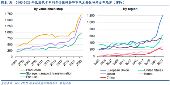 终端应用领域增长迅速,中国仍存在较大差距。以国际专利族(IPF)作为衡量标准统计的全球氢能源专利数据显示,2023年全价值链的技术领域均呈现高速增长态势,全球专利申请量同比增长近20%,较五年前增长近一倍,其中终端应用技术领域的增长尤为突出。从地区对比来看,欧盟在氢能领域的专利申请明显处于世界前列,2023年申请数量达到近1200IPFs(约占全球的29%),美国申请数量超过600IPFs(14%),2023年超过日本处于全球第二。中国尽管近五年专利申请发展迅速,2023年专利申请数量约为200IPFs(5%),但是在体量仍存在较大差距仅为欧盟的1/6,美国的1/3,未来仍存在较大的发展空间。