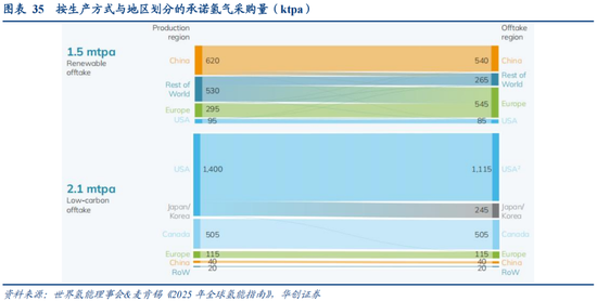中国需求量仅为美国的一半,两者氢气消耗均源自国内供应。从需求端来看,美国仍为当前最大的氢能消耗国,可再生能源制氢与低碳制氢合计采购需求达到120万吨/年,中国仅为美国一半约58万吨/年,少于欧洲66万吨/年处于世界第三位。分生产方式来看,可再生能源制氢的采购地区主要为中国与欧洲,其中中国的氢气消耗量(约54万吨/年)全部来自于国内供应,且基本供需匹配,仅存在小部分产能出口;欧洲对于可再生能源制氢的采购量最大(约54.5万吨/年),供给约一半来自于国内,另一半则主要来自于中东。低碳制氢的采购地区主要为美国和加拿大,其中美国为全球最大的氢气供给国与消耗国,供给大部分除了满足国内需求(约111.5万吨/年)以外,还有小部分满足日韩消耗。当前全球各地区氢气产能基本为自产自销,仅少部分存在国际贸易,未来随着中美产能的扩大以及欧洲等地需求的不断提升,未来氢气进出口体量有望快速提升。