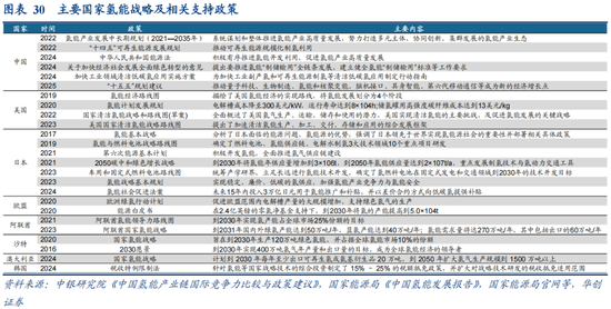 全球氢能发展重要性不断提升,中国各级产业政策持续发力。自1800年左右电解水制氢技术诞生以来,全球掀起了数轮氢能发展热潮,但皆因氢能使用成本居高不下导致未能推动全球氢能产业大发展。近年来,随着大规模、低成本的光伏、风电等可再生能源供应为全球氢能产业发展带来新契机。截至2024年底,全球已有超过60个国家和地区公布氢能发展战略,并且因地制宜结合资源禀赋特征确定制氢技术路线,如日本将氢能定位为国家未来的第一能源;欧盟明确将氢能作为摆脱俄罗斯化石能源依赖的核心手段;美国2023年国家清洁氢战略和路线图明确“到2030年实现清洁氢的经济规模部署”并对氢气生产商实施税收减免,但2025年总统行政令又暂停了向企业提供绿氢补贴。中国氢能战略起步较晚但地位迅速提升,2019年氢能首次写入政府工作报告;2022年3月《氢能产业发展中长期规划(2021-2035年)》首次将氢能定位为未来国家能源体系的重要组成部分和用能终端实现绿色低碳转型的重要载体;2024年氢能作为新兴产业列入政府工作报告任务,同年颁布的《中华人民共和国能源法》从国家法律层面为氢能产业发展提供了明确的指引和保障;2025年氢能作为未来产业被写为“十五五”规划建议。同时,地方政府也因地制宜积极推进氢能产业发展,22个省级行政区将推动氢能发展写入2024年政府工作报告,截至2024年底全国累计发布氢能专项政策超560项,各级产业政策持续发力推动氢能快速高质量发展。