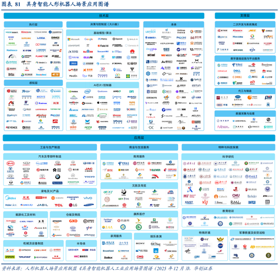中国:①宇树科技:未上市,专注于通用足式/人形机器人的研发,以卓越的运动控制能力闻名。②优必选:“人形机器人第一股”,业务覆盖工业、教育、消费级市场,硬件平台路径的代表企业,代表产品如Walker系列工业人形机器人、AI悟空教育陪伴机器人。③智元机器人:未上市,专注于通用人形机器人研发,采用供应链整合的“快路径”,产品迭代和量产交付速度快,截至2025年12月人形机器人5100+台出货,出货量全球第一。④傅利叶:未上市,专注于研发高性能人形机器人,应用于工业制造和家庭服务。⑤算丰征途:未上市,专注于低速无人驾驶场景,为工厂、园区提供智能配送机器人及解决方案。⑥拓普集团:凭借在智能刹车IBS项目积累的各项技术能力,包括软件,电控、驱动、电机、减速机构、传感器等,公司切入机器人电驱系统及其他相关产品,形成智能汽车+机器人部件的双产业发展模式。⑦赛力斯:依托成熟的大规模精密制造体系和供应链管理能力,与字节跳动(火山引擎)形成“硬件制造+AI智能”协同,成为智能汽车向具身智能延伸的典范。
