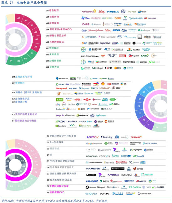 中国:①凯赛生物:全球领先的利用生物制造规模化生产新材料的企业之一,主营长链二元酸系列产品。②华恒生物:以合成生物技术为核心,主要从事生物基产品(如氨基酸、维生素、生物基材料单体等)的研发、生产、销售。③华东医药:以创新药研发为核心、医美业务为突出亮点、工业微生物为特色补充的创新型全球化医药健康企业,在生物发酵领域拥有数十年的深厚积累。④梅花生物:专注于氨基酸的规模化生产与创新应用,现已构建起涵盖动物营养氨基酸、食品鲜味剂、医药级氨基酸、胶体多糖以及大宗副产品的完整产业生态。⑤川宁生物:主营生物发酵技术的研发和产业化,定位于合成生物学研发、生产一体化的产品型公司,是目前业内为数不多的完成了合成生物学从选品—研发—大生产的企业。⑥华熙生物:公司依托合成生物技术,聚焦功能糖、蛋白质、多肽、氨基酸、核苷酸、天然活性化合物等六大类生物活性物的研发、生产和销售,并逐步打造合成生物“生物智造标杆、全产业链标杆、绿色制造标杆”。⑦富祥药业:从事抗感染药物原料药、中间体的研发、生产和销售,在技术同源的基础上,拓展化学合成与生物合成的应用领域,大力发展锂电池电解液添加剂业务和拓展合成生物学微生物蛋白业务。