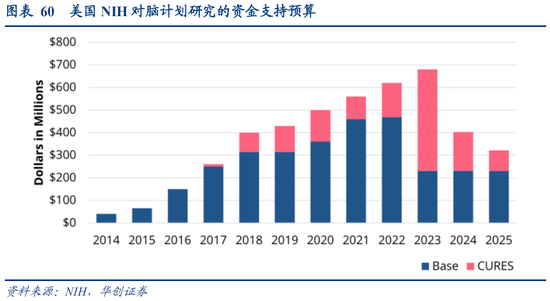各国政策支持力度持续加大以积极抢占行业高地。自二十世纪七十年代“脑机接口”的概念提出以来,当前行业已经逐渐进入技术应用突破期,全球多国均认识到脑科学研究在科技发展与社会进步中的战略性,纷纷将其列为重点对象加以推进以抢占行业高地。美国自2013年正式颁布“脑计划”后大力推进脑科学研究及相关工具的研发工作,2014-2023年期间,美国政府对“脑计划”的投入累计超过40亿美元,体现了政府对脑科学研究及其医学临床转化应用的高度重视。当前美国在大脑相关研究工具、技术以及疗法领域不断取得突破性进展,同时研究方向逐渐转向应用验证,但2025年来受经费削减、人才外流影响研究进展有所放缓。欧盟同样于2013年欧盟发起了一项为期十年的“人脑计划”,总投资额达11.4亿欧元,且在科研产出方面成果颇丰:发表于国际顶级学术期刊的论文超过400篇,在15个国家催生了92项专利,并搭建了具有重大战略意义的EBRAINS神经信息学平台。中国脑机接口研究起步较晚,但党中央和国务院高度重视以脑机接口为代表的未来产业发展,多次就其发展做出重要指引。“十三五”规划将脑科学和类脑研究提升为国家战略;2021年《科技创新2030—“脑科学与类脑研究”重大项目申报》标志着中国脑计划正式启动,国家拨款经费预计超过31.48亿元;2025年《关于推动脑机接口产业创新发展的实施意见》标志着我国脑机接口产业从“科研探索为主”迈向“国家战略引领的产业化攻坚”新阶段。