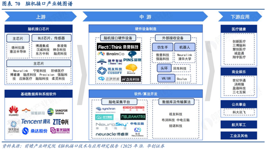 中国:①阶梯医疗:未上市,采用侵入式技术路径,核心竞争力在于材料与工艺的突破:电极尺寸仅为头发丝的百分之一,柔软度极高,能最大程度减少对脑组织的损伤,保障信号长期稳定采集。同时,其植入体体积全球最小,大幅降低了手术创伤和风险。②脑虎科技:未上市,致力于全链条自主研发,涵盖柔性电极、脑电芯片、植入体、手术机器人到脑机操作系统,核心产品为高通量植入式柔性脑机接口。③强脑科技:未上市,领先的非侵入式脑机接口技术公司,专注于脑电信号采集与AI分析。产品线广泛,包括用于教育领域的Focus专注力头环、“开星果”孤独症辅助系统等。④博睿康:未上市,国内脑机接口领域的先驱之一,产品线覆盖从科研级脑电设备到医疗级系统。其微创植入式脑机接口系统NEO,将电极片植入颅内硬脑膜外,主要用于难治性癫痫治疗和神经系统疾病康复。⑤美好医疗:人工耳蜗核心组件与侵入式电极片研发。⑥翔宇医疗:非侵入式脑机接口与康复设备深度融合;