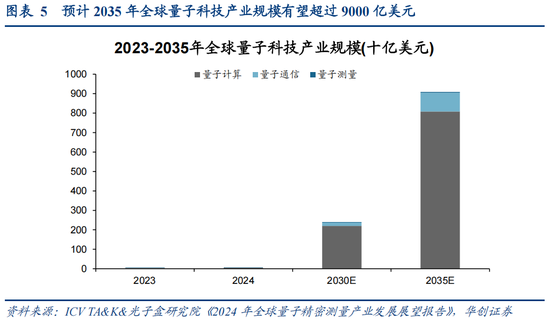 量子技术是基于量子力学原理,通过操控量子叠加、纠缠等特性来实现信息高效处理与安全传输的新型技术体系。量子信息技术是量子科技重要组成部分,主要包括量子计算、量子通信和量子精密测量三大领域,利用量子调控技术实现信息的感知、计算与传输,在提升计算复杂问题运算处理能力、加强信息安全保护能力、提高传感测量精度等方面,具备超越经典信息技术潜力,有望成为重塑科学探索范式、变革信息技术体制、推动数字经济演进的发展新动能。①量子计算:以量子比特为基本单元,利用量子叠加与干涉等实现并行计算的新型计算范式,具备求解计算复杂问题实现指数级加速的潜力,是推动算力跨越式发展的重要方向。②量子通信:基于量子叠加与纠缠等效应,在经典信道辅助下实现密钥分发或量子信息传输的新型通信方式。③量子精密测量:对外界物理量变化导致的微观物理系统量子态变化进行调控和观测,实现高精度传感测量,精度、灵敏度和稳定性等核心指标比传统技术有数量级提升。根据光子盒研究院预测,截至2024年全球量子科技产业规模约为80亿美元,预计2035年有望超过9000亿美元,复合年均增长率有望达到53.8%,其中量子计算规模有望超过8000亿美元。