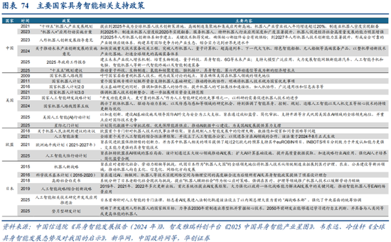 各国均高度重视具身智能发展,不断提升细分领域关注度。全球人工智能历经了较为长远的发展历程,主要经济体均高度重视具身智能的发展并推出众多支持政策。美国于2009首次发布“国家机器人路线图”以推动机器人基础研究与跨领域合作,但近年来对机器人技术的直接支持持续减少,重点转向对于软件层面的AI基础研究支持,如25年美国人工智能(AI)行动计划、星际之门计划等,以保障AI基础技术(如大语言模型、多模态感知等)处于主导地位。欧盟在具身智能领域的发展较为缓慢,注重“立法先行”,考量战略实施中的安全性,引导具身智能稳步发展。日本以应对老龄化社会的AI应用场景为先导,力推具身智能机器人步入现实性商业应用,2025年以来政策支持明显提速。我国对于具身智能的顶层政策推动起步较晚,但却表现出极高的战略定位,在国务院关于《新一代人工智能发展规划》指引下,具身智能作为“AI+”的终极形态,已经成为新质生产力的典型代表以及各省布局产业规划的关注重点。未来具身智能有望对社会生产组织形式重构、国家制造业竞争力等起到至关重要的作用,各国将在这一领域展开激烈竞争,预计相应的产业支持政策仍有望持续发力。