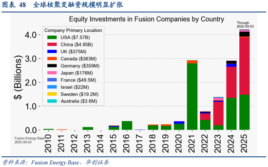 近五年全球核聚变权益融资规模明显上升。截至25Q3全球核聚变企业2025年权益融资规模已经超过40亿美元,较24年全年提升超10亿美元。从国别来看融资格局呈现中美双强的态势且2023年以来中国企业融资规模已经超过美国,2010年至今美国企业共融资75.7亿美元(约占全球的54.5%),中国达到49.5亿美元(35.6%),远超第三名英国3.8亿美元。2025年融资规模前五大公司分别为中国聚变能源有限公司(中国,21亿美元)、Commonwealth Fusion Systems(美国,8.7亿美元)、Helion Energy(美国,4.3亿美元)、能量奇点(中国,2.4亿美元)、Proxima Fusion(德国,1.5亿美元)。