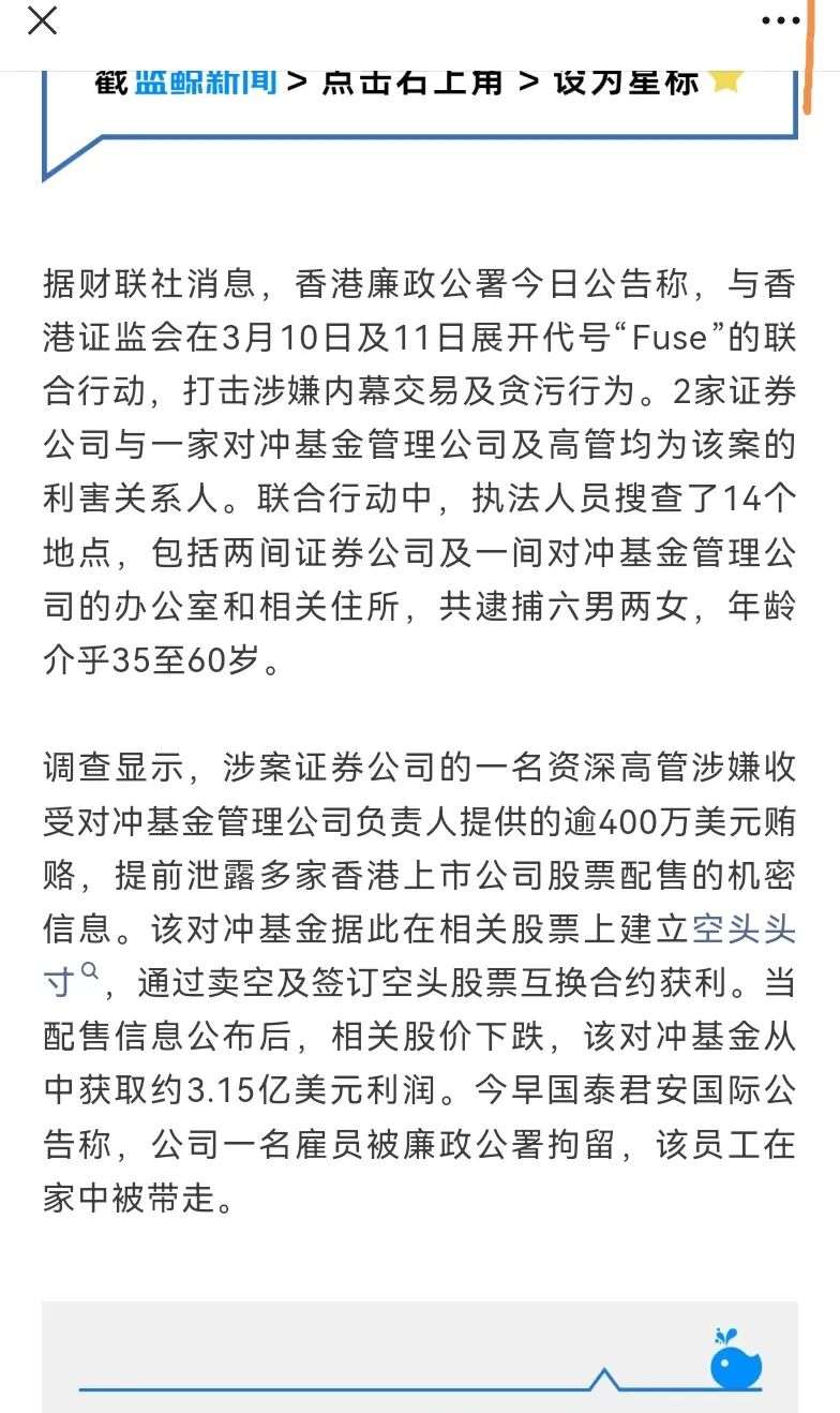 香港廉政公署公告:打击IPO内幕交易及贪污行为逮捕六男二女!那个家伙收了400万美元!