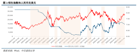 我们还观察到在过去每一轮AH牛市中,人民币汇率均处于升值通道。在人民币持续贬值阶段,港股也较少走出全面牛市。