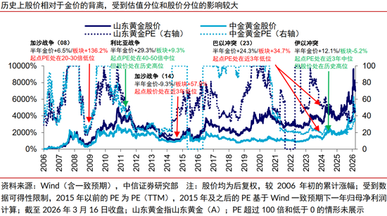 历次中东冲突后,尽管战争相关因素会放大短期金价弹性,但中期走势仍取决于美元信用和流动性因素。展望本轮冲突,预计流动性宽松以及美元信用弱化两大趋势的延续将继续推升金价。历史上估值或股价分位的优势会强化黄金板块的上涨空间,而当前头部公司PE估值水平回落至15-20x的历史低位,同时考虑到近年来股价高点和金价高点高度同步,我们看好金价新高推动的股价新高。