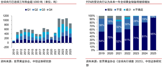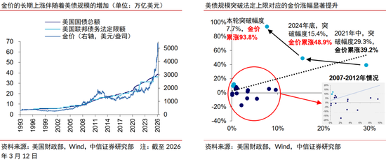 2)二是美元信用弱化趋势延续,“美债担忧”溢价有望强化。世界黄金协会数据显示,俄乌冲突以来,“去美元化”趋势促进全球央行购金潮延续,2022-2024年均净购金量超千吨,2025年维持863吨高位,本质原因在于市场对于美国在美债问题、对外频繁涉及以及对内机制运作方面的担忧不断升温,这一趋势有望延续。历史上美债法定上限上修以及美债规模突破法定上限后的半年内,金价平均涨幅分别为4.4%/11%。当前美债上限的财政约束效应显著削弱,“上限不断上修-持续被突破”的无限循环有望带动金价持续上涨。参照金融危机后金价在美元信用弱化背景下相对于美债规模的“超涨”程度,我们测算当前金价合理位置达到5000美元/盎司以上,而美元信用弱化、流动性宽松以及避险情绪三方因素的叠加有望助力年内金价迈向6000美元/盎司。