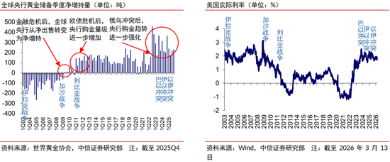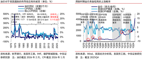 1)一是流动性宽松通道不改,“类滞胀”担忧提供潜在催化。近三年美国就业不及预期程度较高的时期,金价通常加速上涨,包括2024年3-10月、2025年9-10月和2025年12月-2026年1月。2026年2月美国非农和失业率数据罕见地再次共同指向美国就业走弱风险,有利于市场降息预期升温,我们预计沃什担任美联储主席后全年仍有1-2次25bps的降息,流动性宽松通道不会反转。叠加关税、原油对于美国通胀的影响滞后体现,Q1-3主要经济体的实际利率有望相继走低,有助于ETF增仓并利好金价。历史上仅有两次战争(两伊战争、俄乌战争)后的油价上涨使得美联储转向紧缩,并导致金价下跌,战争爆发时均美国通胀均具备本就高企的特征,而当前的静态通胀水平与油价传导幅度均已大幅降低,且美国的政策导向也存在较大差异。考虑到历史上美国滞胀时期的金价上涨概率较大、涨幅较高,当前美国经济“类滞胀”风险加剧,对金价有潜在利好。