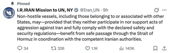 此外,当地时间25日,伊朗常驻联合国代表团发表声明表示,非交战国家的船只可以安全通过霍尔木兹海峡。声明称,只要该船只所属国不参与或支持针对伊朗的敌对行动,并全面遵守已公布的安全和安保规定,即可在与伊朗相关主管部门协调的情况下,享有通过霍尔木兹海峡的安全通行权。