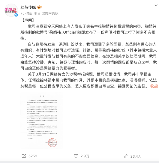 3月31日,一则关于知名艺人鞠婧祎被实名举报偷税漏税的消息引爆舆论。