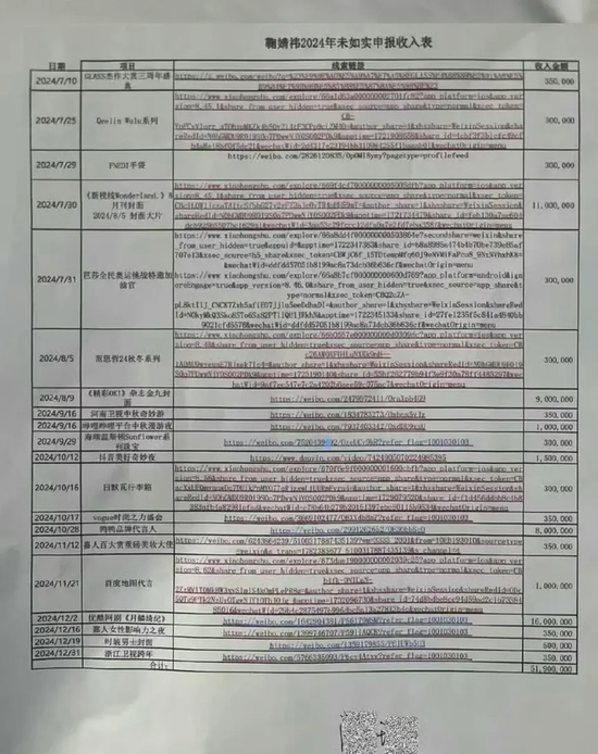 此外,B站中秋夜、抖音奇妙夜、浙江卫视跨年等晚会演出,以及海瑞温斯顿等品牌站台活动,均有明确收入记录。举报方还附上了收入申报表、未申报项目明细等佐证材料,质疑其通过个人工作室拆分收入、规避纳税义务。