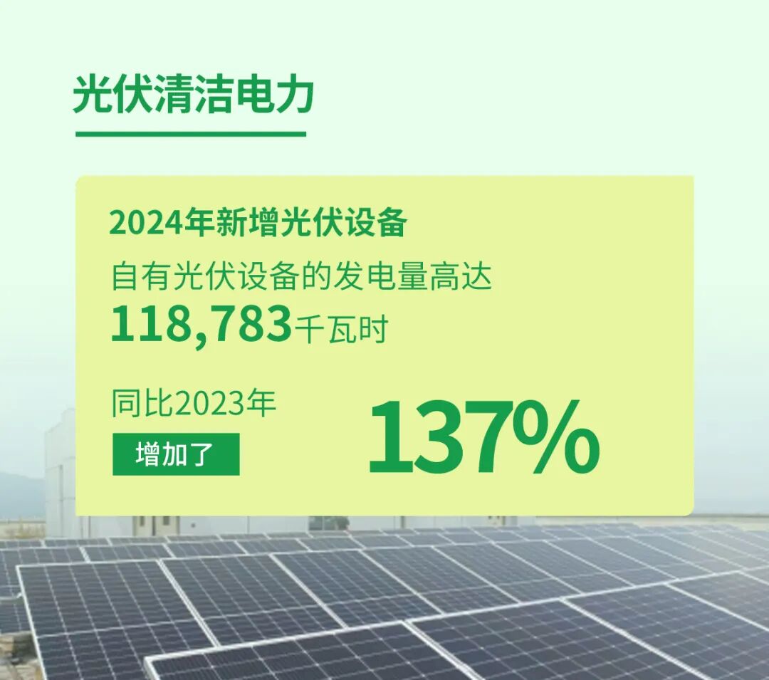 洁特生物通过兴建自有光伏发电设备机组,在自身运营中持续引入可再生清洁能源,减少对外部传统能源的依赖,从而有效降低碳排放量。洁特生物投入的新一批屋顶光伏设备在2024年1月装机并投入使用,新增的光伏设备整年产电73,546千瓦时, 洁特生物自有光伏设备在2024年总产电量为118,783千瓦时,同比2023年增长137%,大幅提升了绿色能源使用比例。