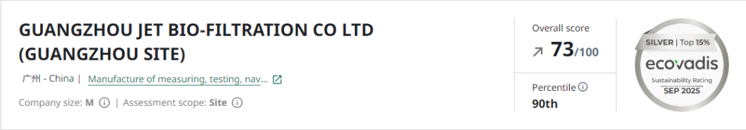 洁特生物在2024年的EcoVadis评审中已经拿到过银牌,在2025年再次凭借过去一年在各评选议题中的出色表现,成功跻身全球13万家企业中的前15%,又一次荣获银奖。