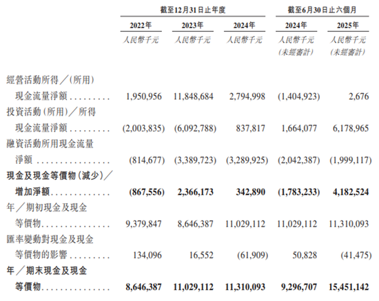 据公司招股书,2022至2024年及2025年上半年,公司经营活动现金流净额分别为19.5亿元、118.5亿元、27.9亿元,267.6万元,呈现剧烈波动的情况。2025年前三季度,公司经营活动现金流净额回升至32.85亿元,主要得益于期内原材料采购付款同比减少。