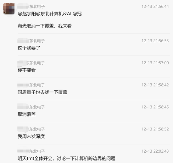 两天前,东北证券电子组李某某在大群里艾特计算机组的三个同事,要求他们取消覆盖海光信息个股研究。