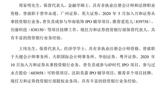 耐人寻味的是,万和证券并没有提及两名保代“严格遵守法律法规,执业质量良好”之类的措辞。