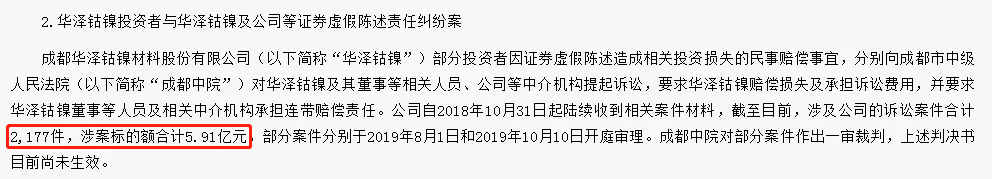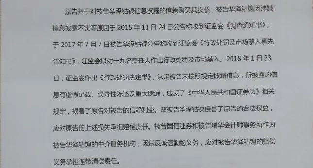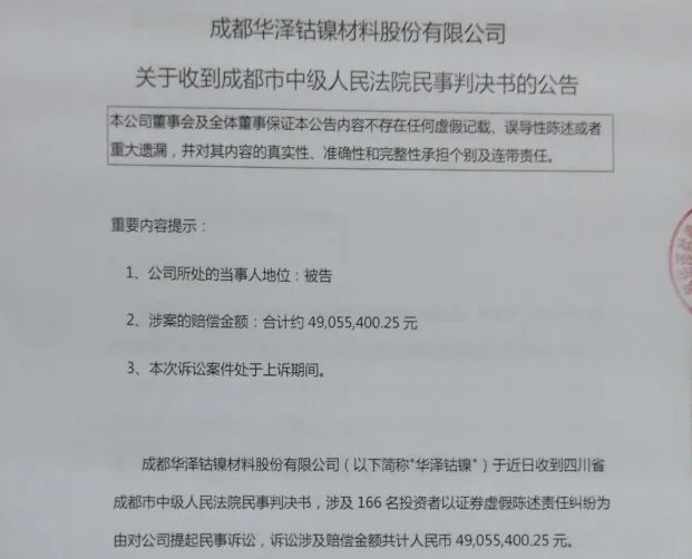 虽然字迹模糊,行家还是得以了解:因证券虚假陈述责任纠纷,166名投资者将华泽钴镍、国信证券和瑞华所告上法庭,索赔金额合计4905.54万元。成都中院一审支持了投资者的全额索赔请求,并判国信证券和瑞华所分别承担40%和60%的连带责任。