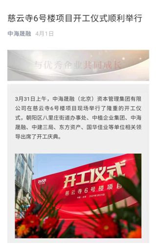 4月1日,中海晟融在官方公众号上发表了一篇名为“慈云寺6号楼项目开工仪式顺利举行”的文章。文章显示,3月31日上午,中海晟融在慈云寺6号楼项目现场举行了隆重的开工仪式,中植企业集团、中海晟融、中建三局、东方资产等单位相关领导出席了开工盛典。