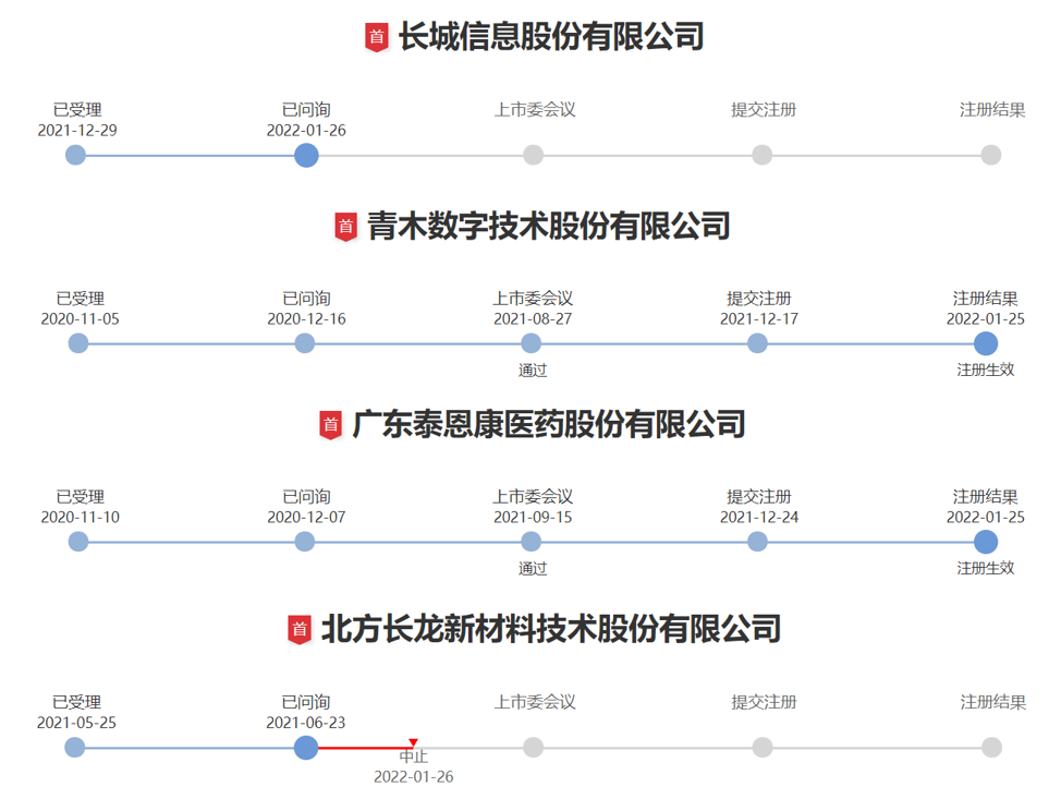 昨日至今创业板新增长城信息1家问询企业,新增青木股份等2家注册生效企业,新增北方长龙1家终止企业。