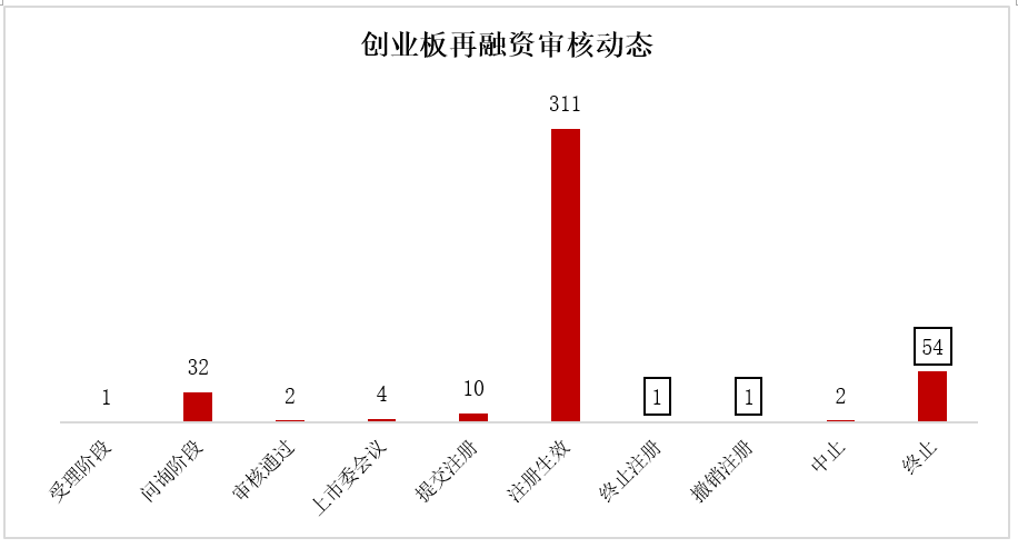 再融资方面,目前处于受理阶段有1家,问询阶段的有32家,审核通过2家,上市委会议通过4家,提交注册10家,注册生效311家,撤销注册1家,终止注册1家,中止2家,终止(撤回)54家,合计418家。