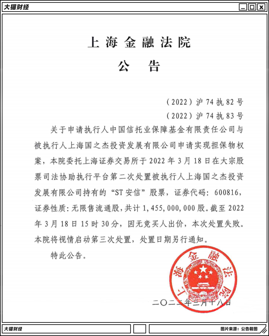 上个月,来自上海金融法院发布的信息显示,安信信托14.55亿股股份第二次进入司法处置程序,但最终因无人竞价而处置失败。