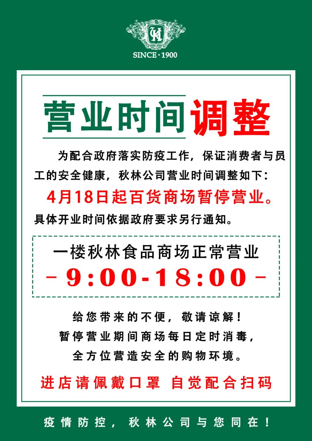 根据《哈尔滨市应对新型冠状病毒感染肺炎疫情工作指挥部第59号公告》要求,自2022年4月18日起秋林公司百货商场暂停营业,一楼食品商场正常营业。具体通知如下: