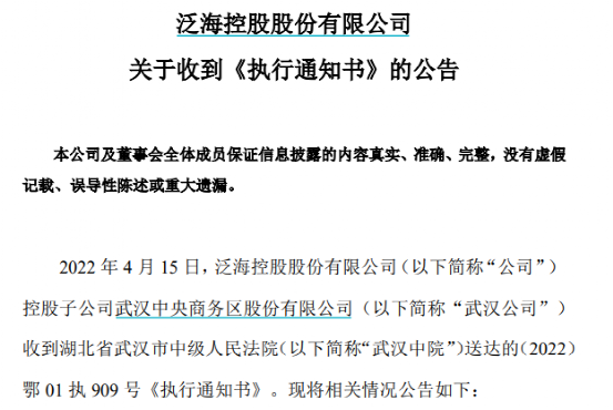 4月18日晚间,泛海控股公布关于收到《执行通知书》的公告,其控股子公司武汉中央商务区股份有限公司收到湖北省武汉市中级人民法院送达的(2022)鄂 01 执 909 号《执行通知书》,涉及标的超过22亿元。