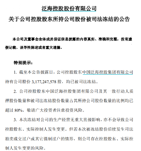 4月12日,泛海控股发布公告显示,中国泛海所持的21.84亿股股份被司法冻结,冻结执行人为北京金融法院。该部分股份占中国泛海所持股份的68.741%,占总股本的42.032%。在此次股份冻结后,中国泛海持有的泛海控股股份均被司法冻结。