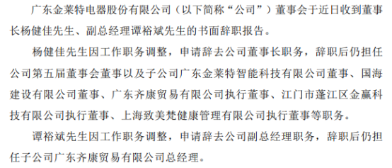 杨健佳因工作职务调整,申请辞去公司董事长职务,辞职后仍担任公司第五届董事会董事以及子公司广东金莱特智能科技有限公司董事、国海建设有限公司董事、广东齐康贸易有限公司执行董事、江门市蓬江区金赢科技有限公司执行董事、上海致美梵健康管理有限公司执行董事等职务。