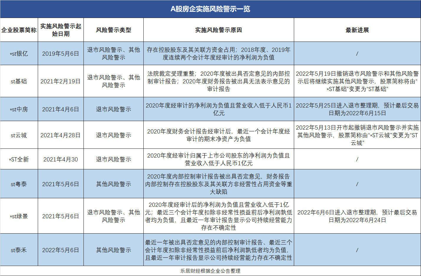 而据乐居财经不完全统计,目前A股市场已被实施退市风险警示或其他风险警示的房企共8家,包括中房股份、银亿股份、海航基础、云南城投、绿景控股、深圳全新好、粤泰股份、泰禾。