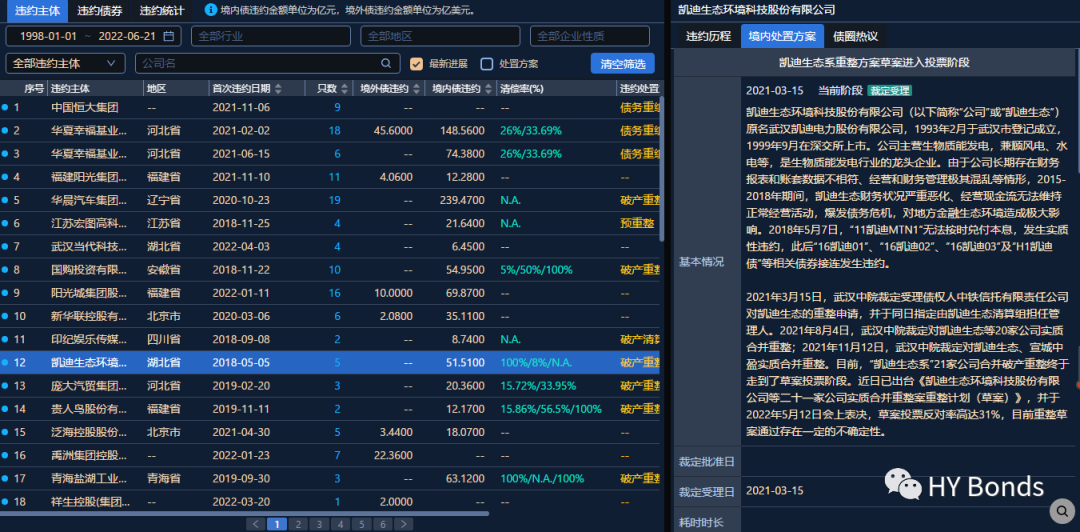 2021年3月15日,武汉中院裁定受理债权人中铁信托有限责任公司对凯迪生态的重整申请,并于同日指定由凯迪生态清算组担任管理人。2021年8月4日,武汉中院裁定对凯迪生态等20家公司实质合并重整;2021年11月12日,武汉中院裁定对凯迪生态、宣城中盈实质合并重整。目前,“凯迪生态系”21家公司合并破产重整终于走到了草案投票阶段。近日已出台《凯迪生态环境科技股份有限公司等二十一家公司实质合并重整案重整计划(草案)》,并于2022年5月12日会上表决,草案投票反对率高达31%,目前重整草案通过存在一定的不确定性。