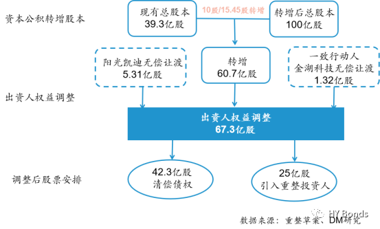 根据DM研究获取到的重整计划草案,本次凯迪生态重整草案中特别划分了原先的普通债权,分别归类为燃料类经营债权和其他普通债权两组。其中燃料类经营债权以20万元为界限,低于20万元(含)部分进行现金全额清偿,高于部分按每年形成的经营净现金流的30%进行现金清偿;其余普通债权分成三种方案,包括1)按照100元分得11.7647股比例进行债转股清偿;2)按8%债权留债展期,由当前时点计算需要14年完成清偿;3)通过以股抵债、信托受益权、留债展期方式清偿,90%进行债转股,剩余10%信托受益权+留债展期方案进行清偿。另外,有财产担保债权按照9年期限进行展期偿还。