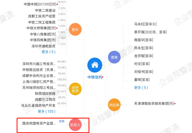 中国中铁股份:控股中铁信托78.91%股份,通过旗下关联公司持股后,实际控股中铁信托92.99%的股份;中国中铁是全球最大建筑工程承包商之一,2018年在《财富》世界500强企业排名第56位,股东背景为国务院国资委,为央企信托公司。