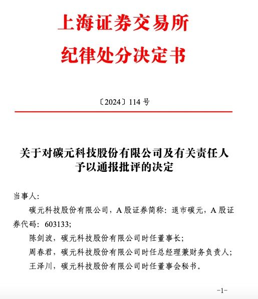 6月25日,上海证券交易所下发关于对碳元科技股份有限公司(以下简称“退市碳元(维权)”或“公司”)及有关责任人予以通报批评的决定。上交所称,因业绩预告披露不准确且未及时更正,决定对退市碳元及时任董事长陈剑波、时任总经理兼财务负责人周春君、时任董事会秘书王泽川予以通报批评。