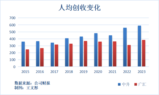 与中升控股相比,广汇汽车的员工数量更多,但从2016年之后,人均创收、人均净利润一直少于中升控股,经营效率低于中升控股。以2022年为例,广汇汽车的人均创收约为312.75万元,约为中升控股的56%,人均净利润约为-6.37万元,转盈为亏。
