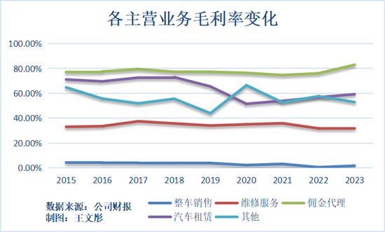 通过对比公司主营业务营收和毛利率数据,可以发现占公司主要营收的整车销售毛利率却最低,而毛利率更高的维修服务、佣金代理、汽车租赁等业务营收方面没有明显提升,汽车租赁业务营收还有不小的下滑。2023年汽车租赁业务毛利率约为59.27%,微增约2.45%;营收约为12.48亿元,同比下降约23.39%。