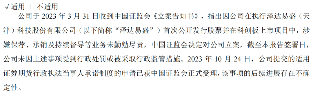其中就包括在执行泽达易盛科创板IPO项目中,涉嫌保荐、承销及持续督导等业务未勤勉尽责,在2023年3月被证监会立案调查。