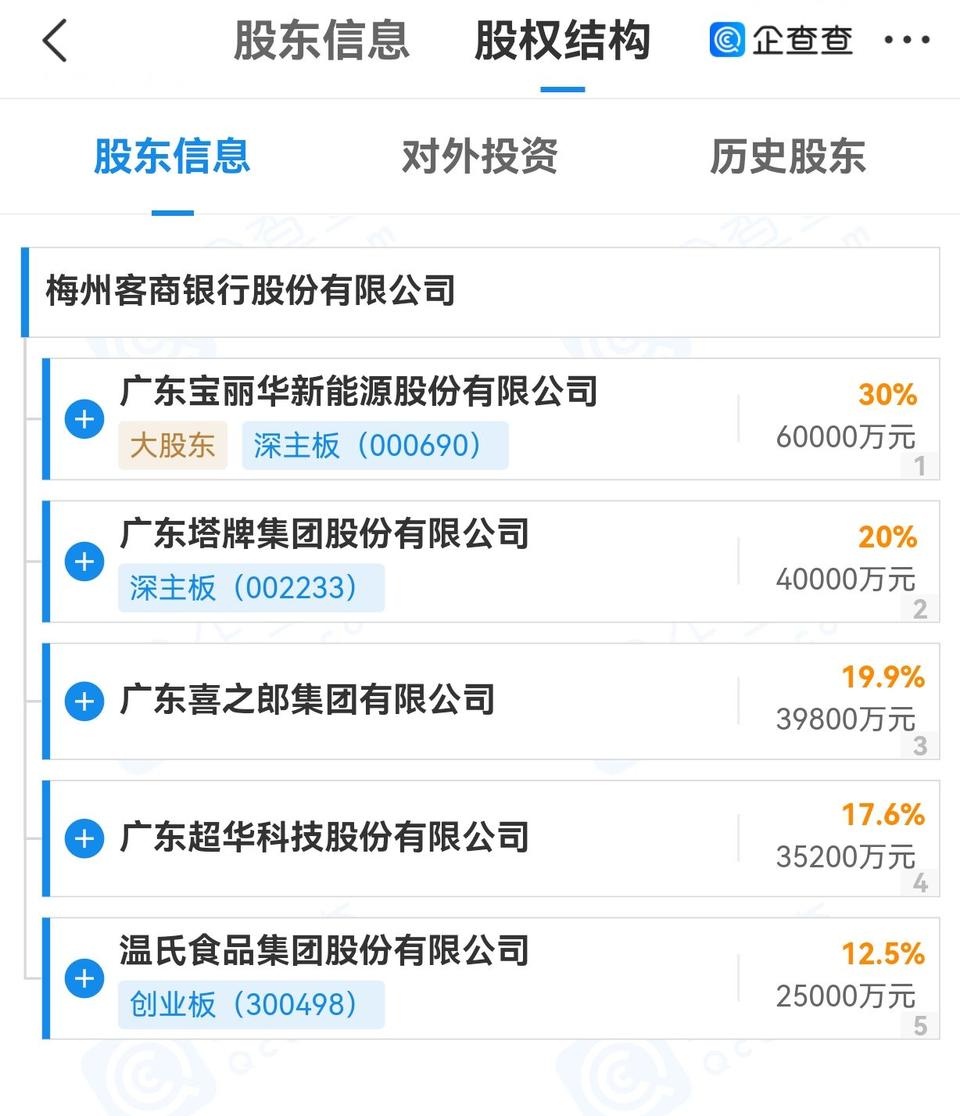 梅州客商银行官网显示,该行于2017年6月正式开业,其有五大股东,分别是宝新能源、塔牌集团、喜之郎、*ST超华和温氏股份。